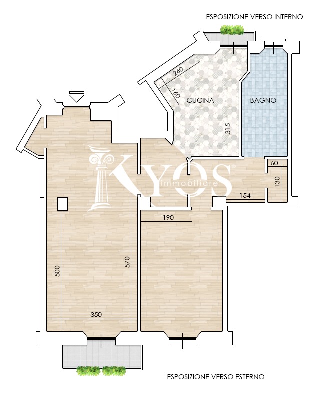 L'appartamento è composto da ingresso, soggiorno, cucina abitabile, camera matrimoniale, bagno, ripostiglio, due balconi e cantina di pertinenza.