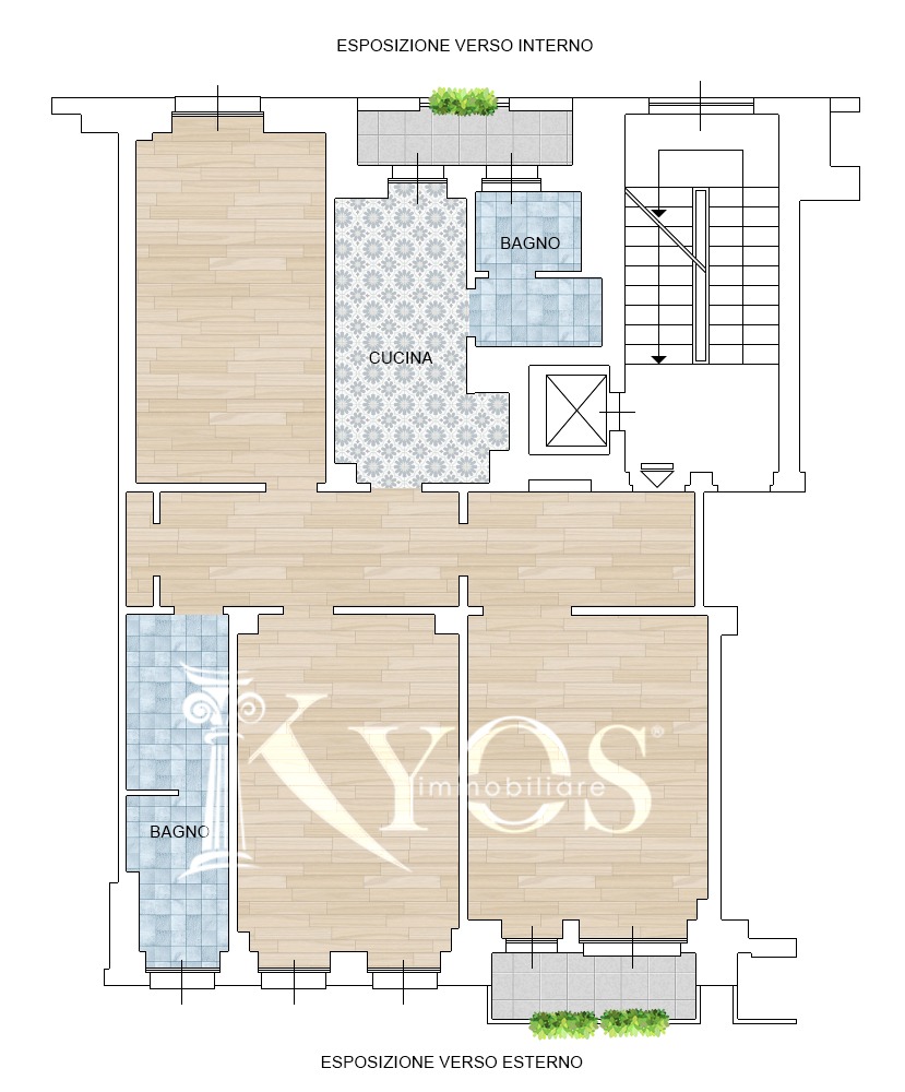 L'appartamento è così composto: ingresso, soggiorno, cucina abitabile, due camere da letto, due bagni, due balconi, e cantina di pertinenza.