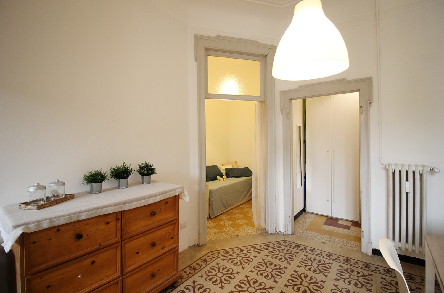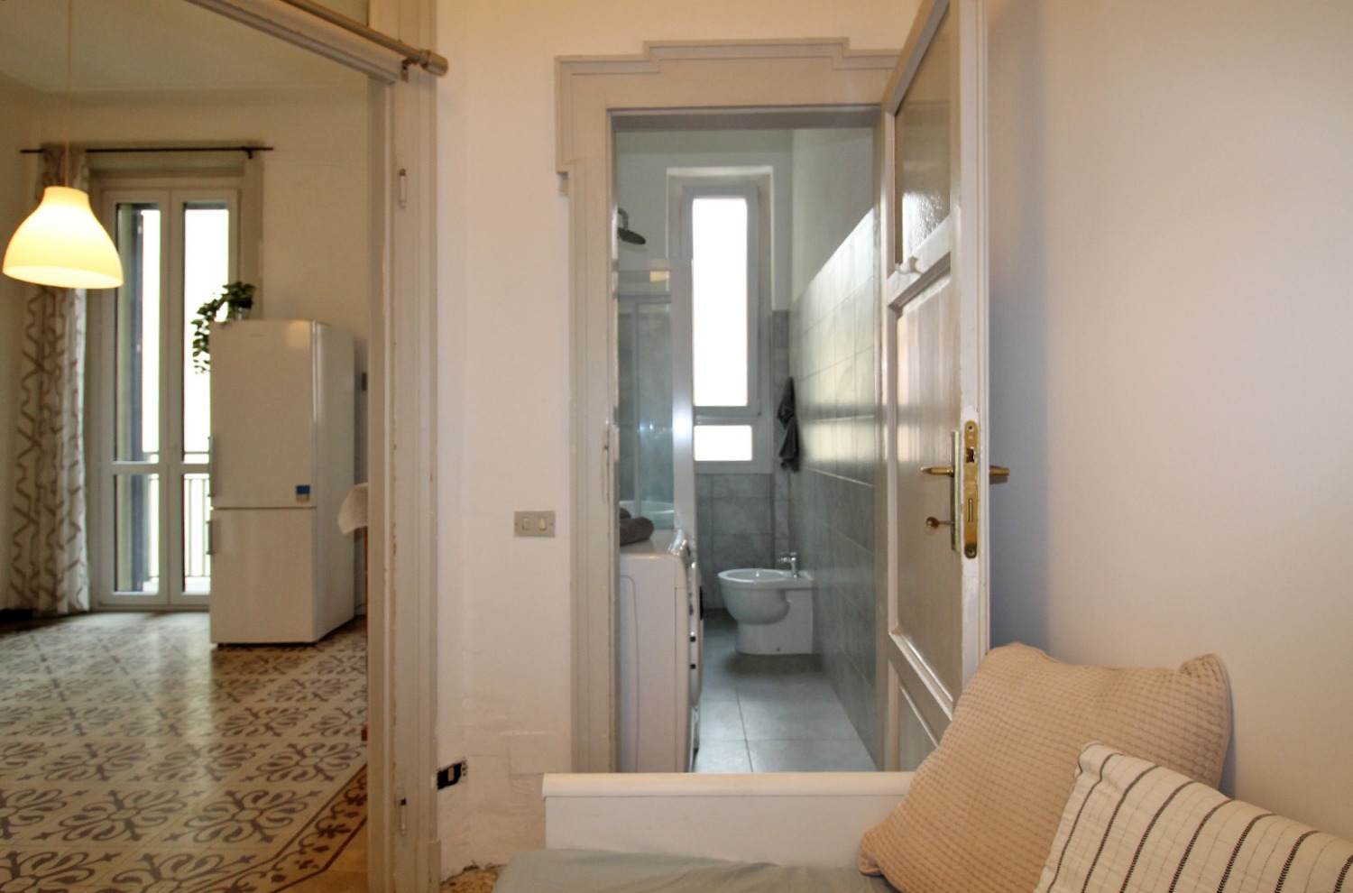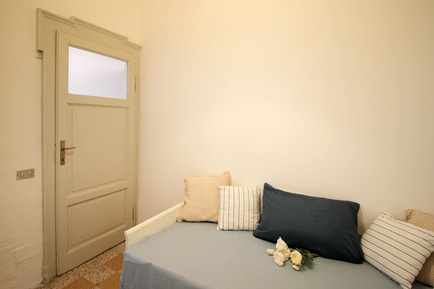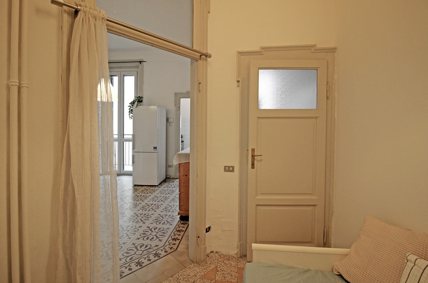 Gli interni conservano il carattere autentico delle finiture originali tipiche degli edifici storici: le cornici alle porte interne, le cementine e la generosa altezza dei soffitti contribuiscono a creare un’atmosfera accogliente e di impatto. La posizione al piano intermedio, unita all’affaccio interno esposto a ovest e alla tranquillità di una via poco trafficata, assicura un ambiente silenzioso e ben illuminato nelle ore pomeridiane.