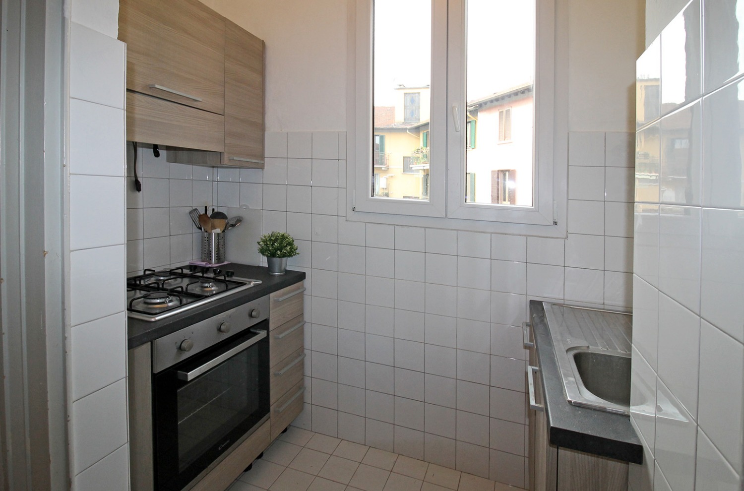 L’ingresso, tramite un disimpegno, introduce direttamente nella zona giorno/notte, organizzata in modo funzionale e a pianta quadrata, mentre il cucinotto risulta separato e comodo da utilizzare. Un’ampia zona antibagno, particolarmente versatile, può essere trasformata in una pratica cabina armadio. Il bagno, finestrato e dotato di box doccia, è affiancato da un balcone con affaccio interno. Completa la proprietà una cantina di pertinenza, utile come spazio aggiuntivo di deposito.