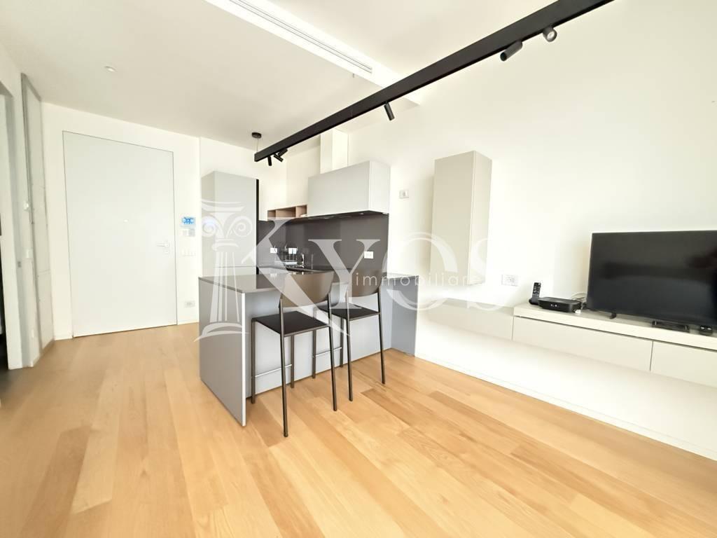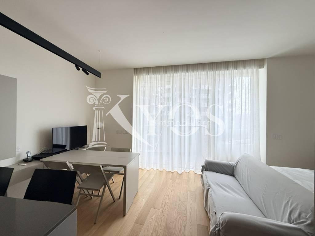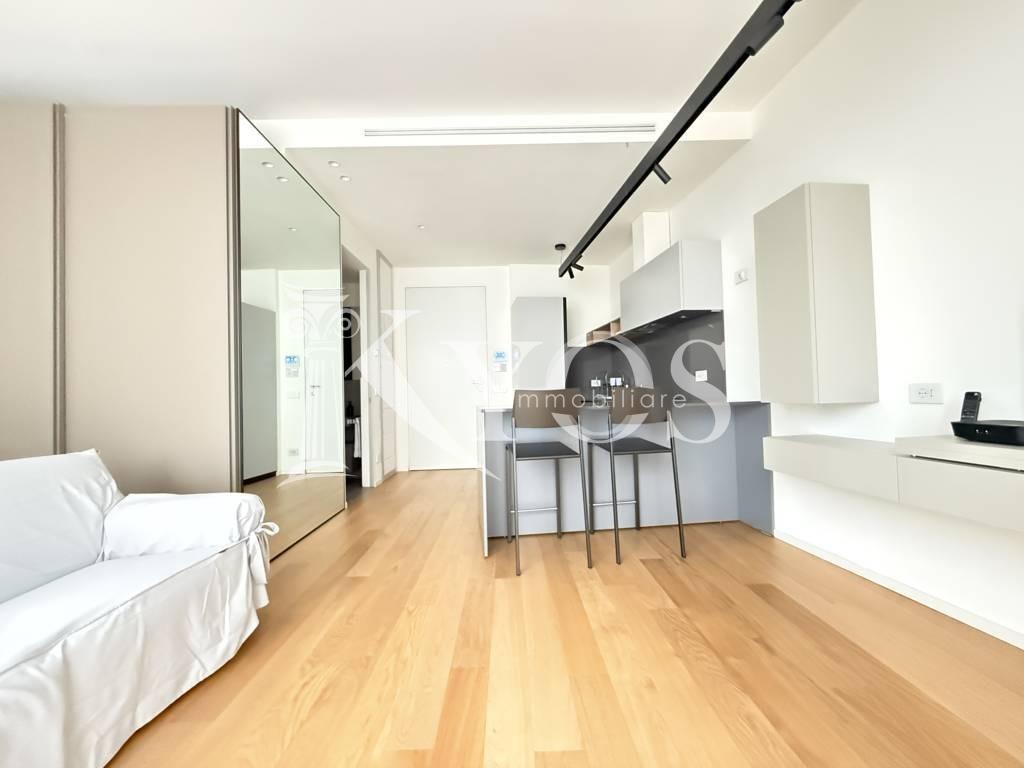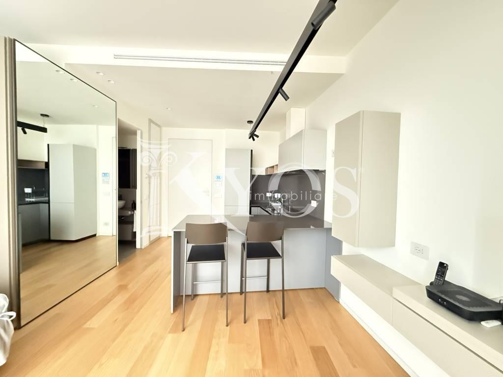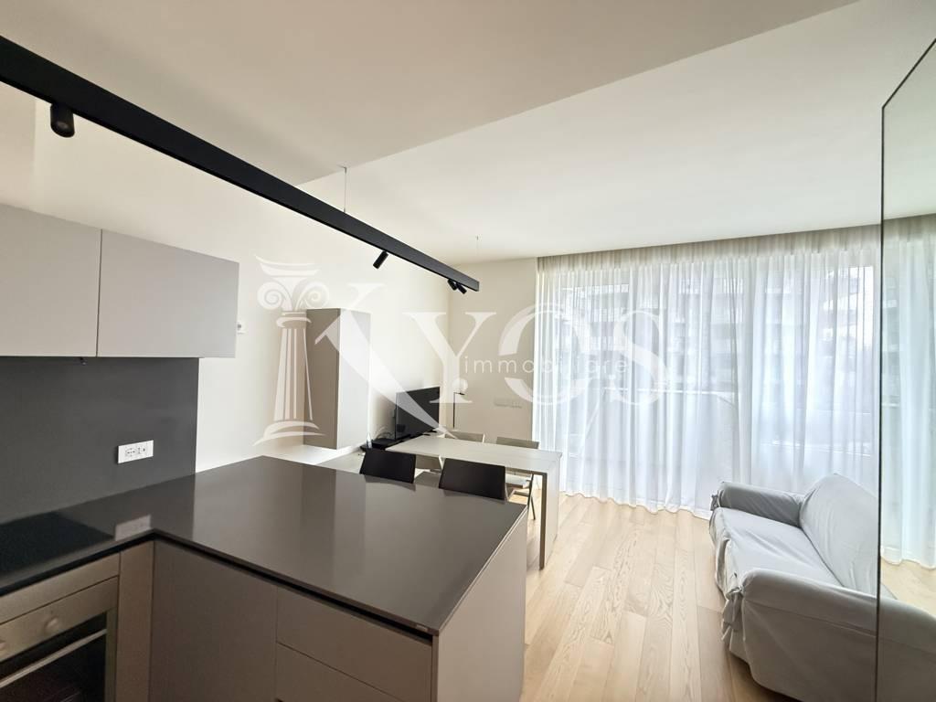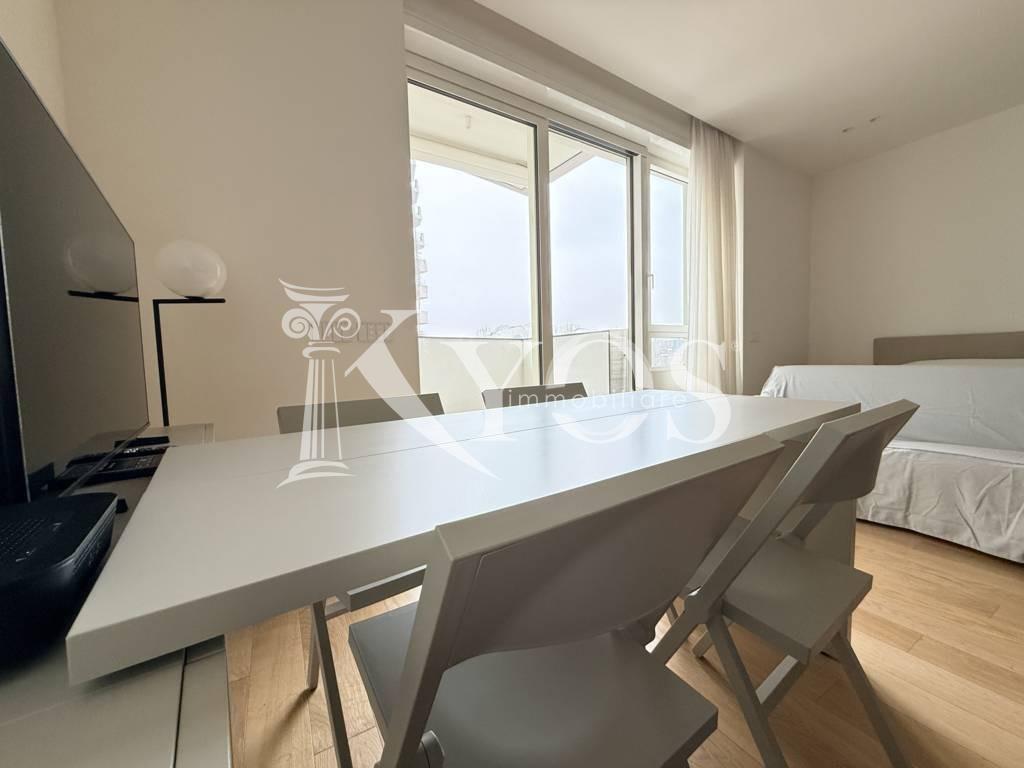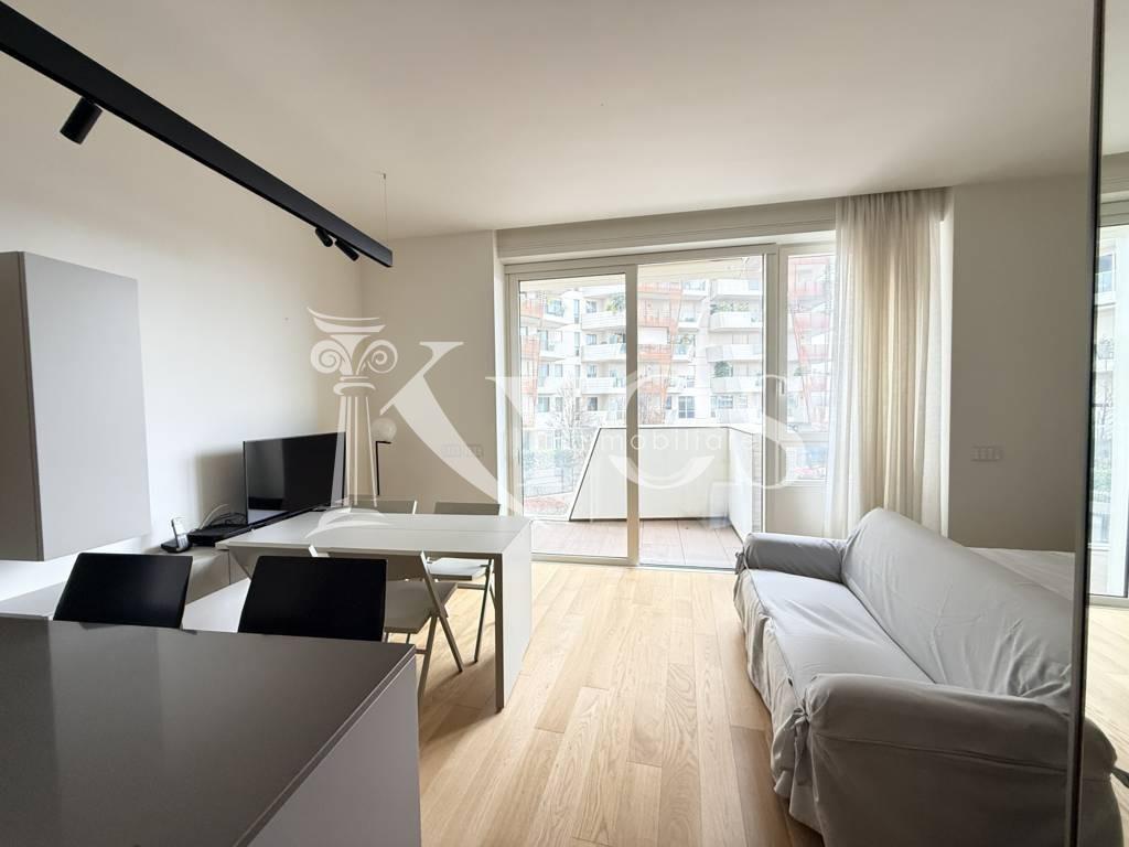 CityLife, tra i contesti più esclusivi e contemporanei di Milano, Kyos Immobiliare propone in locazione un elegante monolocale arredato e corredato situato al primo piano di una delle iconiche Residenze Libeskind.