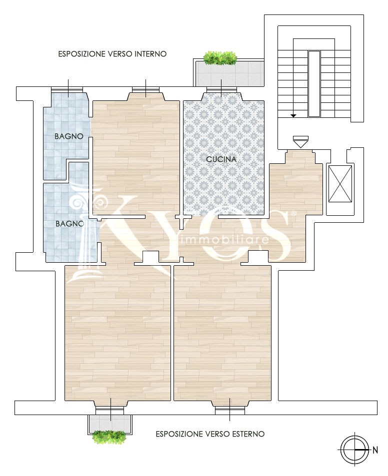 La disposizione degli ambienti prevede un soggiorno, una cucina abitabile arredata, due camere da letto, due bagni e tre balconi .