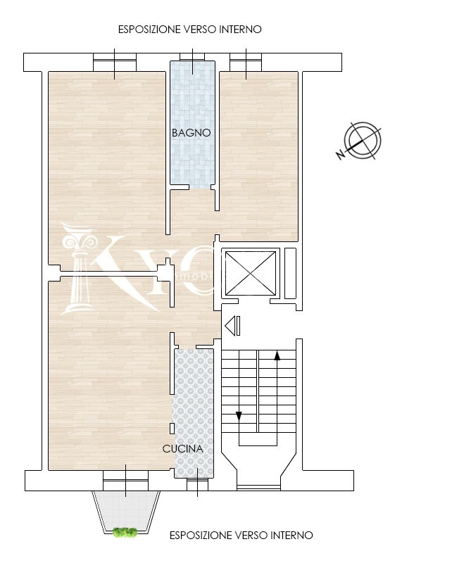 Gli ambienti si presentano suddivisi in un ingresso, cucinotto, due camere, bagno e balcone sul soggiorno con silenzioso affaccio interno.