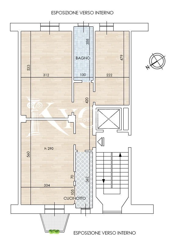 Gli ambienti si presentano suddivisi in un ingresso, cucinotto, due camere, bagno e balcone sul soggiorno con silenzioso affaccio interno.