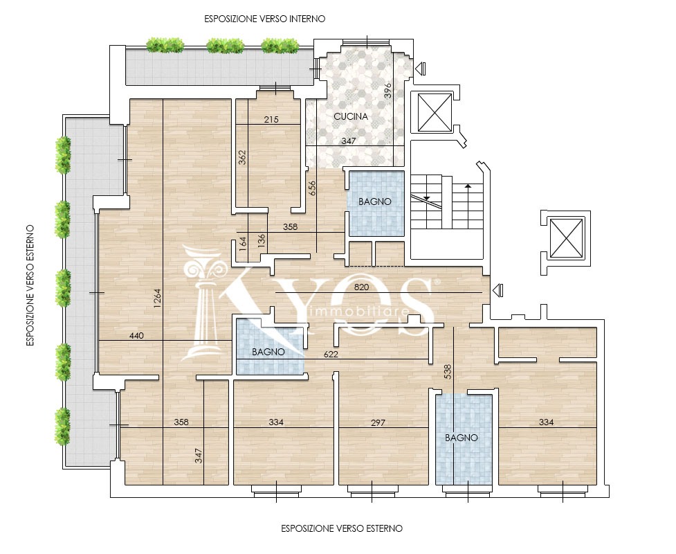 L'immobile esposto a sud, con tripla esposizione, è composto da ingressi padronale e di servizio, un salone doppio con ampie superfici vetrate con balconi, con affaccio su P.le Bacone, studio, tre camere e due bagni nella zona notte, cucina abitabile, camera singola e bagno nella zona di servizio, tre balconi di cui uno accessibile dalla cucina, cantina e, venduto separatamente ad € 70.000, un pratico box auto di buone dimensioni al primo piano interrato.